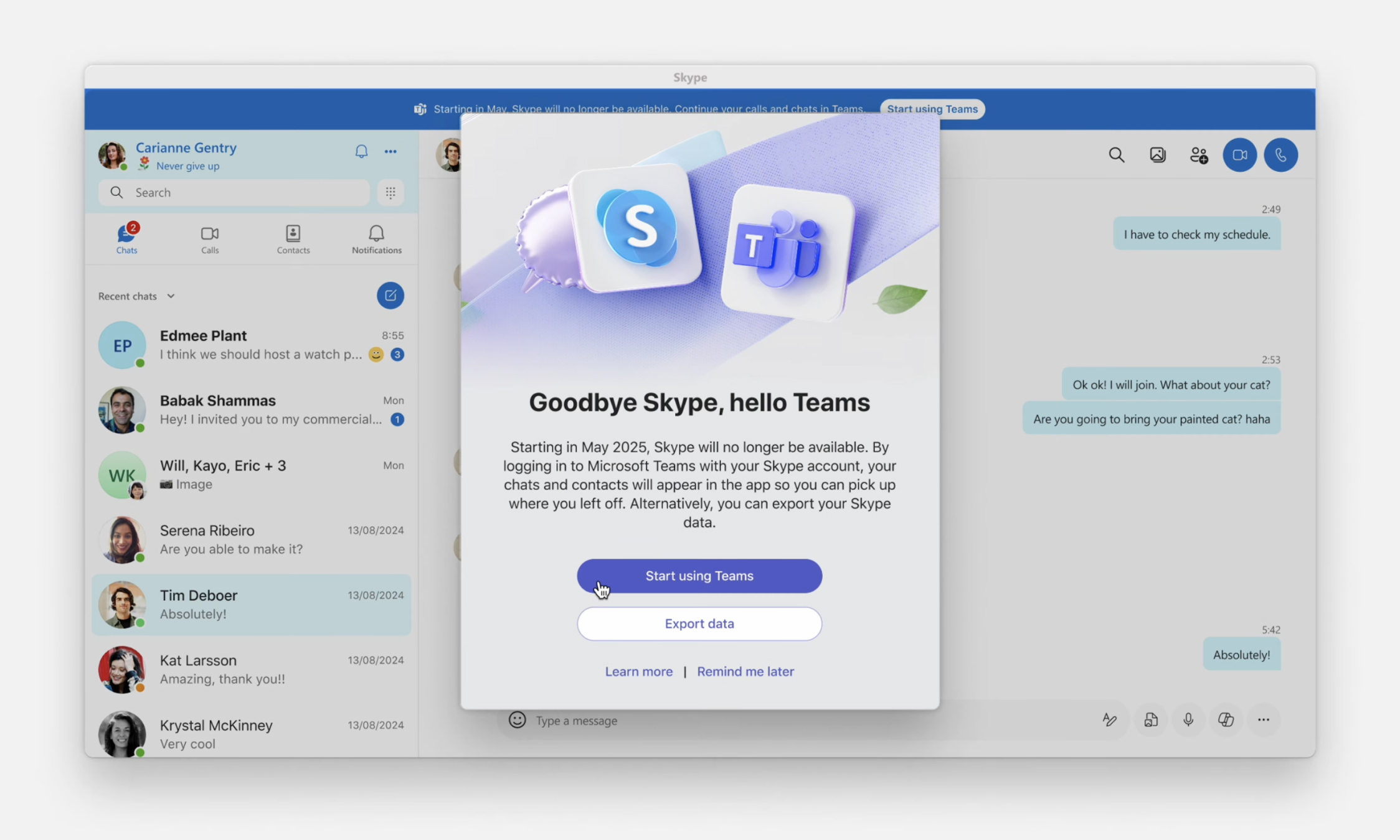 Microsoft ve svém oficiálním oznámení uznává, že Skype sehrál důležitou roli v moderní komunikaci a umožnil spoustu důležitých momentů. Přiznává také, že změny mohou být těžké, ale věří, že Teams nabídne uživatelům ještě lepší možnosti spojení.